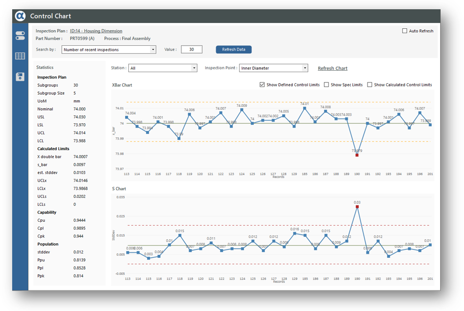 Control Charts can be viewed just by selecting an Inspection Plan defined for a Part Number and Process. With auto refreshing feature, the Control Charts can be displayed beside the equipment for real-time process control and monitoring. The control charts can also be inserted into a custom Dashboard to be merged with other production visuals on the same screen. Subgroup data, as well as raw measurement data can be exported into Excel spreadsheets for external processing.