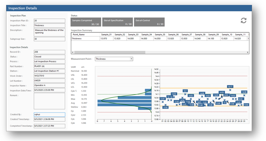 User can also drill down to a subgroup. The screenshot shows the inspection details, the measured values of every sample, the calculated statistics and distribution charts for one subgroup of measurement data.